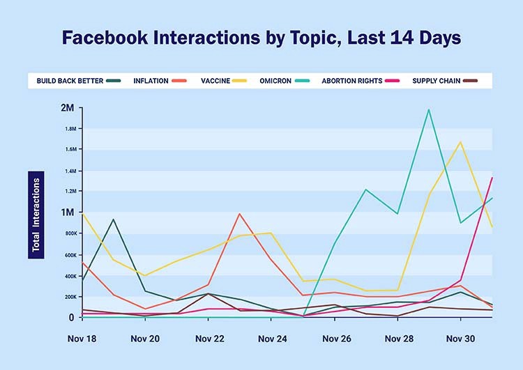 The Bipartisan Infrastructure Deal, by contrast, saw multiple spikes upon its passage in Congress and President Biden’s recent signing of the bill, generating over 1.5 million interactions on both occasions, with half of the top ten posts coming from the Joe Biden or POTUS accounts. While there was some criticism of the policy from conservative pages, the tone was mostly positive. Time and time again, we have seen that the public responds most to legislation passing — let’s hope we can celebrate an even bigger win with the Senate passage of the Build Back Better Act soon.