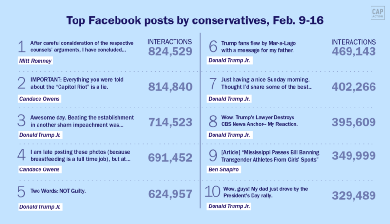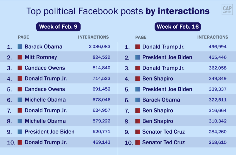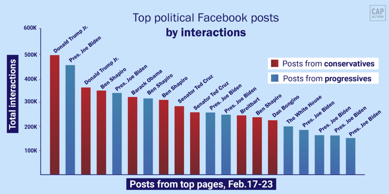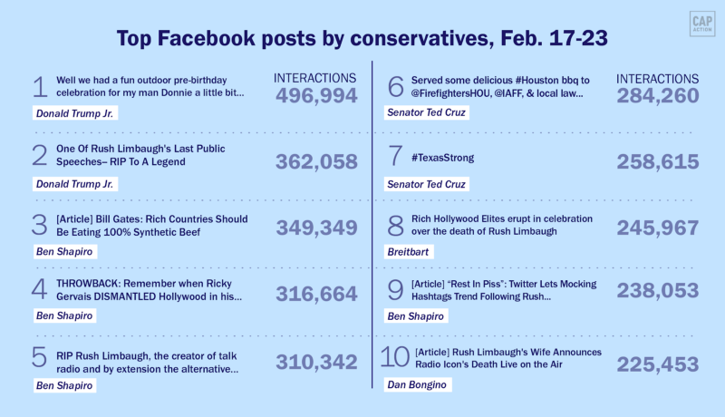 Shock Jock and Awe: While conservatives took to Facebook to remember Rush Limbaugh, progressives tackled a news-packed week and proved they can, in fact, walk and chew gum at the same time. Progressives published top posts on the Texas winter storm, the state of the pandemic, and economic recovery, among other topics. A photo shared by President Biden was the top performer on the left, but it couldn’t beat out a post from Don Jr. celebrating his son’s birthday.