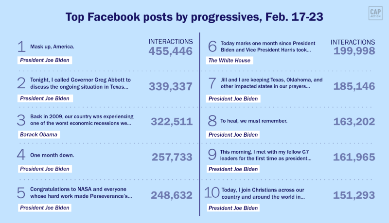 And while conservative pages mostly memorialized Rush Limbaugh, Ted Cruz also cracked the top 10 twice with posts about the Texas winter storm. In what might come as a shock to folks who spent a lot of time monitoring this conversation on Twitter, no posts holding him accountable made the top 10 on Facebook for progressives.