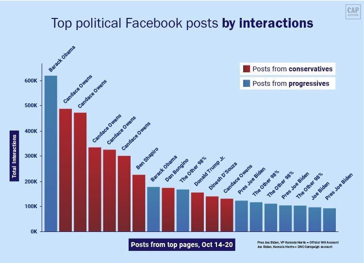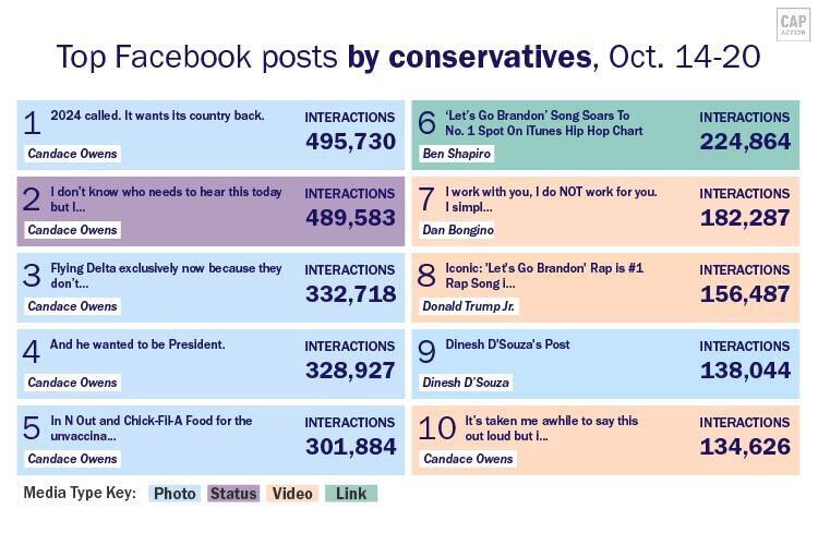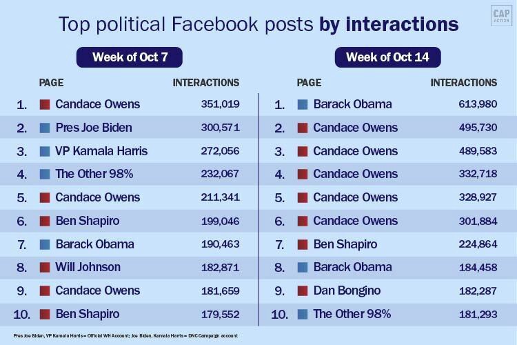 After several weeks of strong performance by progressives, conservatives — and more specifically, Candace Owens — dominated this week’s ranking of top political Facebook posts.