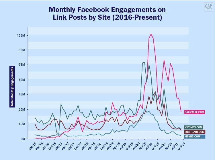 - Third, after the Biden administration took office in January 2021, we saw both the New York Times and Breitbart experience a sharp decrease in engagements, reflective of the return to normalcy and a “boring” presidency. MSNBC’s decline came much earlier, in fall 2020. But the Daily Wire’s engagements held staying power, continuing to rack up tens of millions of engagements per month well into 2021. Only in the last couple of months — with an initial drop in July and then another in September — has the Daily Wire experienced a decline toward pre-2020 levels.