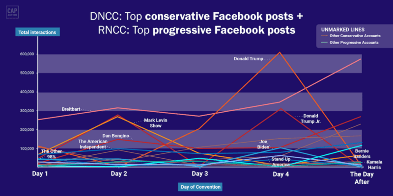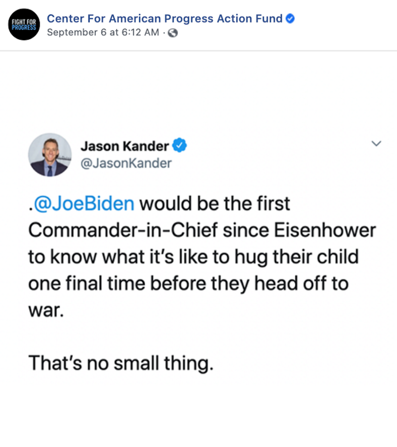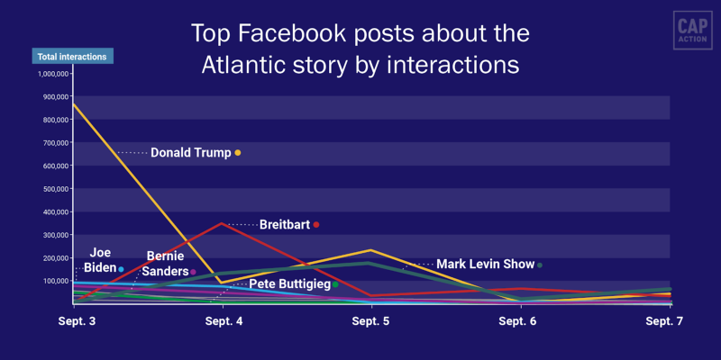Trump’s first post on the topic (he would post five more times), received more than 645,000 interactions on Facebook — compare that to the most-interacted with progressive piece on the topic, a post from Joe Biden that earned 86,000 interactions. Over the course of the weekend, conservative posts about the Atlantic story garnered over 2 million interactions (mostly from Breitbart, Mark Levin and Trump himself), while progressives earned only about ⅓ as much, around 650,000 interactions (largely from Joe Biden, Pete Buttigieg and Bernie Sanders).