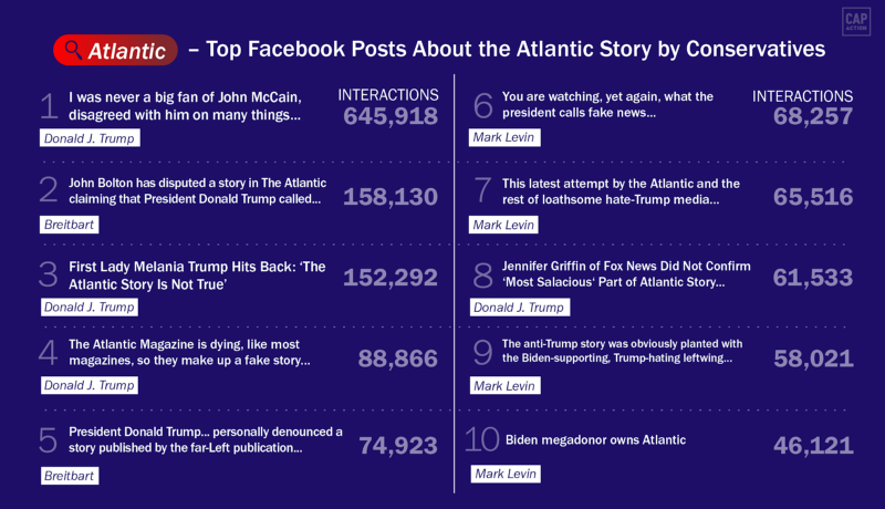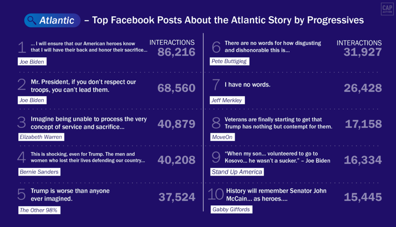 And finally, progressives need to speak with one voice. After Trump tried to discredit the Atlantic story on Facebook, other conservative pages took notice. Suddenly, everyone from Breitbart to Mark Levin and Ben Shapiro had joined in.