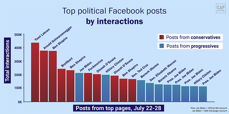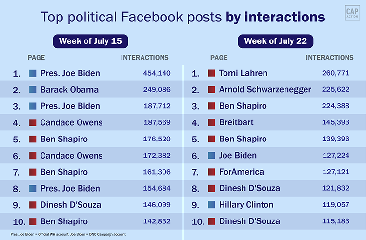 Top 10 best-performing political Facebook posts on the left and right for the weeks of July 15 and 22 by interactions, according to data from NewsWhip.