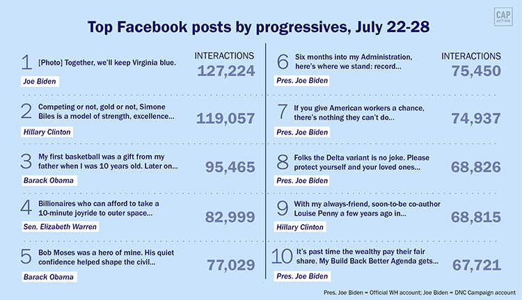 It was a tough week for progressives on Facebook, but President Biden and Hillary Clinton’s pages did break the top 10 with posts about Terry McAuliffe and Simone Biles, respectively.