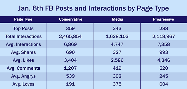 Analysis of the top 1,000 Facebook posts related to January 6th in the U.S., according to data from NewsWhip. “Media” refers to neutral media pages without an ideological lean.