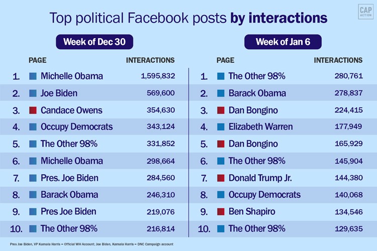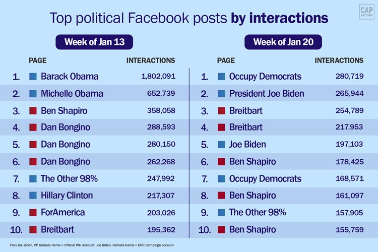 Top 10 political Facebook posts by interactions for the weeks of January 13th and 20th, according to data from NewsWhip