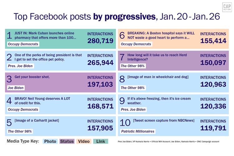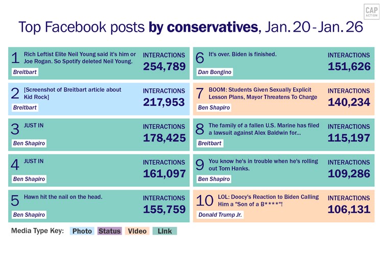 Top ten Facebook posts from progressive pages over the last week, according to data from NewsWhip.Top ten Facebook posts from conservative pages over the last week, according to data from NewsWhip.