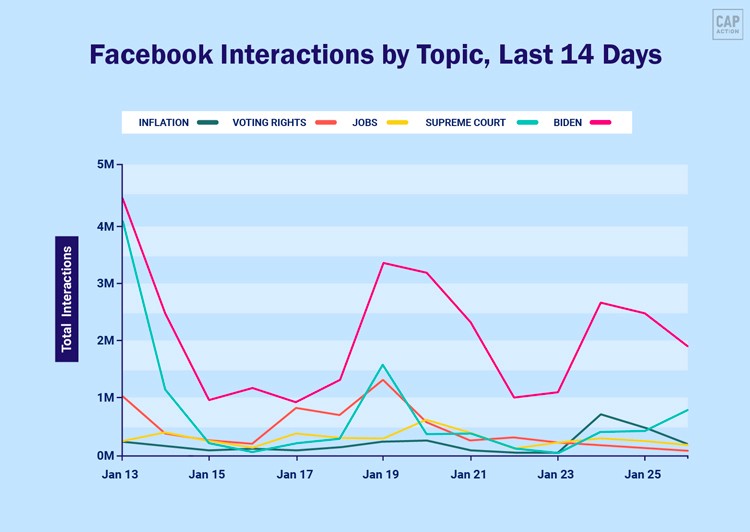 President Biden’s name is always near the top of the engagement charts on Facebook, but over the last two weeks there has been a lot of news. First, the Supreme Court struck down the administration’s vaccine mandate on January 13th, which conservatives celebrated. Then, on January 19th, the Senate debate of the Freedom to Vote and John Lewis Voting Rights Acts John grabbed the national spotlight, with voting rights-related posts from progressive and conservative pages alike earning 1.3 million interactions.