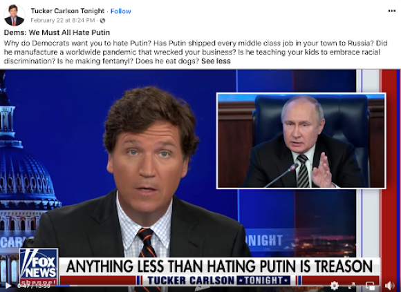 In a wide-ranging monologue, Carlson said, “Democrats in Washington have told you you have a patriotic duty to hate Vladimir Putin,” questioned why Russia’s actions would pose any threat to the U.S, compared the conflict to immigration reform, and mocked the President and Vice President as weak leaders supposedly ignoring domestic problems. This monologue was re-broadcast in Russia on Russia Today. In another video, Carlson asked why Ukraine was worth defending from Russian aggression and questioned what “values’’ dictate a U.S. response.