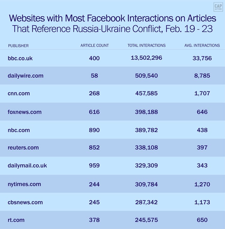 To that end, we looked at where people on Facebook were getting their information on the Russia-Ukraine conflict in the days leading up to the invasion (February 19–23). According to data from NewsWhip, 240,000 articles were published referencing “Ukraine” or “Putin” in these five days, generating nearly 30 million interactions on Facebook globally. Of those, the most-engaged web publishers are below.
