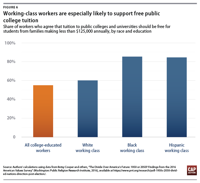 Workers also support policies to make public college more affordable. The rising cost of higher education has made it more difficult for individuals to finish college. Driven in part by declining state spending on higher education in recent years, the average tuition for a public four-year college grew by 289 percent—even after adjusting for inflation—from 1980 to 2014.41 While community college tuition has not grown as fast, many students there struggle to afford basic necessities such as food.42 The majority of workers support policies to address this issue and to increase access to higher education by providing free tuition programs at public colleges to families making less than $125,000 per year.43 Workers of all races without college degrees are more likely to support this policy than workers who currently have a college education.44
