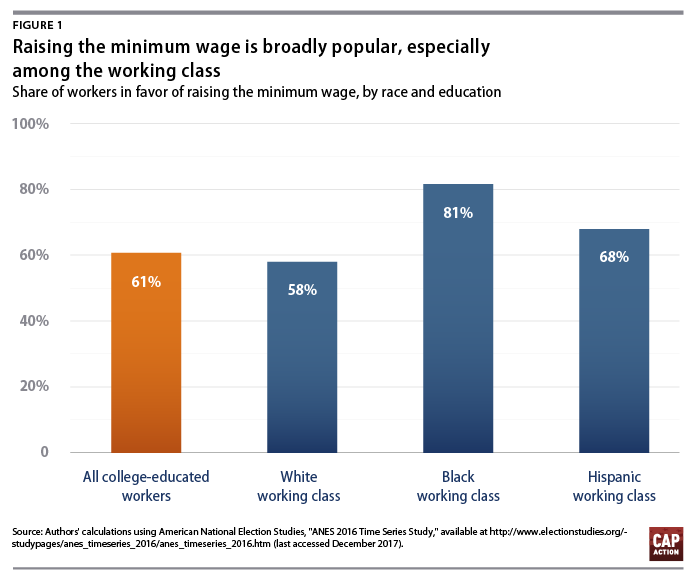 Ending the nine-year slide in many minimum-wage workers’ purchasing power by raising the federal minimum wage is broadly popular among workers. Data from the ANES found that 61 percent of college-educated workers and 58 percent of white working-class workers support raising the minimum wage.19 Black and Hispanic members of the working class show even higher levels of support, with 81 percent and 68 percent in favor of increasing the minimum wage, respectively.20