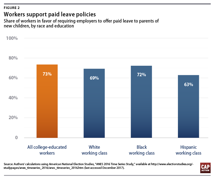 Today, just 15 percent of civilian workers—and just 6 percent of low-wage workers—have access to paid family leave.25 As a result, working families lose an estimated $20.6 billion in wages each year from being forced to quit working or reduce their work hours—and this does not take into account the potential long-term consequences of unemployment.26 Data from the ANES show that members of the working class are broadly in support of expanding access to paid leave, with support across racial and ethnic groups ranging from 63 percent of Hispanics to 69 percent of whites to 72 percent of black workers. 27 Support from college-educated workers stands at 73 percent. 28