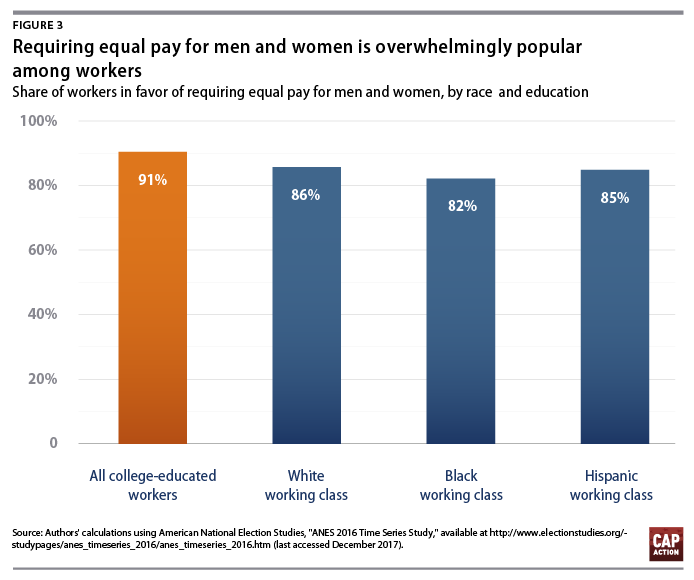 These pay disparities undermine women’s and families’ economic security. Therefore, it is no surprise that policies to close the gender pay gap are broadly popular across education level and race. The vast majority of white, black, and Hispanic workers without a college degree—as well as the majority of college-educated workers—support equal-pay policies.32 While there are laws on the books that are intended to ban pay discrimination, they have not been updated as necessary to ensure they properly govern today’s workplaces.33 In order to protect workers, policymakers should consider policies that hold employers accountable for inequitable practices and that ensure transparency, such as those banning prior salary information requests in the hiring process or requiring the inclusion of salary ranges on job postings.34
