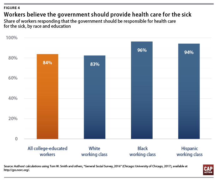 The vast majority of workers believe that it is the government’s responsibility to provide health care for those who are sick. According to the 2016 GSS, more than 4 in 5 college-educated workers and members of the white working class stated that the government “definitely should” or “probably should” be responsible for providing health care.35 Black and Hispanic members of the working class are even more likely to have this view than members of the white working class.36