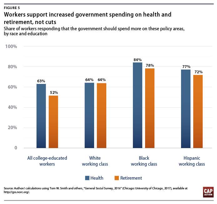 Yet when workers are asked if they prefer cutting or increasing spending on government health care programs and retirement programs, they predominantly want increased investment—not cuts. Seventy-one percent of workers without college degrees would prefer the government spend more on health care, and 67 percent of these workers would prefer increased spending on retirement programs as well. College-educated workers similarly prefer boosted spending, with 63 percent supporting more health care spending and 52 percent supporting more spending on retirement benefits. Polling from GBA Strategies and the Center for American Progress this year similarly shows broad-based opposition to cuts to programs that protect Americans’ living standards, including Social Security Disability Insurance, Medicaid, and the Supplemental Nutrition Assistance Program.39 This polling also found that white, black, and Hispanic members of the working class oppose so-called work requirements in Medicaid that would allow states to take Medicaid away from workers who are not currently employed or participating in a government-approved training program.40