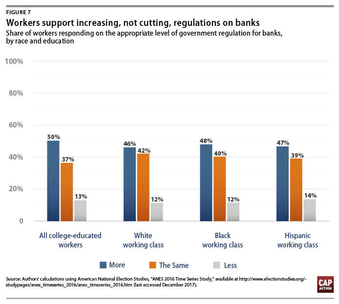 While there has been a degree of bipartisan support for bank deregulation in the current session of Congress45, workers are united across racial and class lines against reducing bank regulation. Among those without college degrees, 46 percent of workers support more banking regulation and 12 percent favor less; views are similar regardless of race.46 College-educated workers are similarly opposed to reducing regulations on banks. This shows that principled opposition to bills such as the Economic Growth, Regulatory Relief, and Consumer Protection Act—which rolls back enhanced regulations from the Dodd-Frank Act for 25 of the 38 largest banks in the United States—would be both a political winner and good policy.47