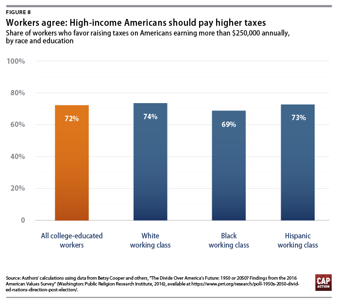 Regardless of race or education levels, raising taxes on high-income earners is very popular among workers. According to 2016 AVS data, the majority of working-class workers of all races, as well as college-educated workers, support instituting a new tax on those making more than $250,000 annually.48 Members of the white working class are the most supportive, with 74 percent in favor of raising taxes on these taxpayers.49
