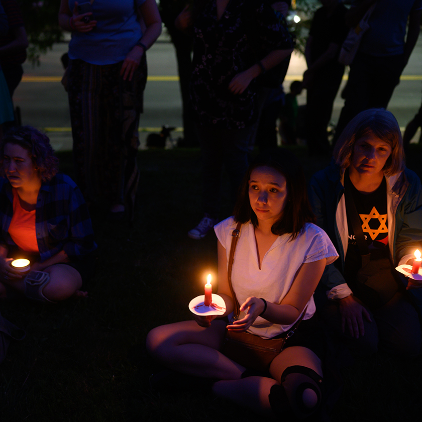 A candlelight vigil for the victims of the El Paso and Dayton shootings is held in the Squirrel Hill neighborhood of Pittsburgh, Pennsylvania, blocks from the Tree of Life Synagogue, August 2019. (Getty/Jeff Swensen/The Washington Post)